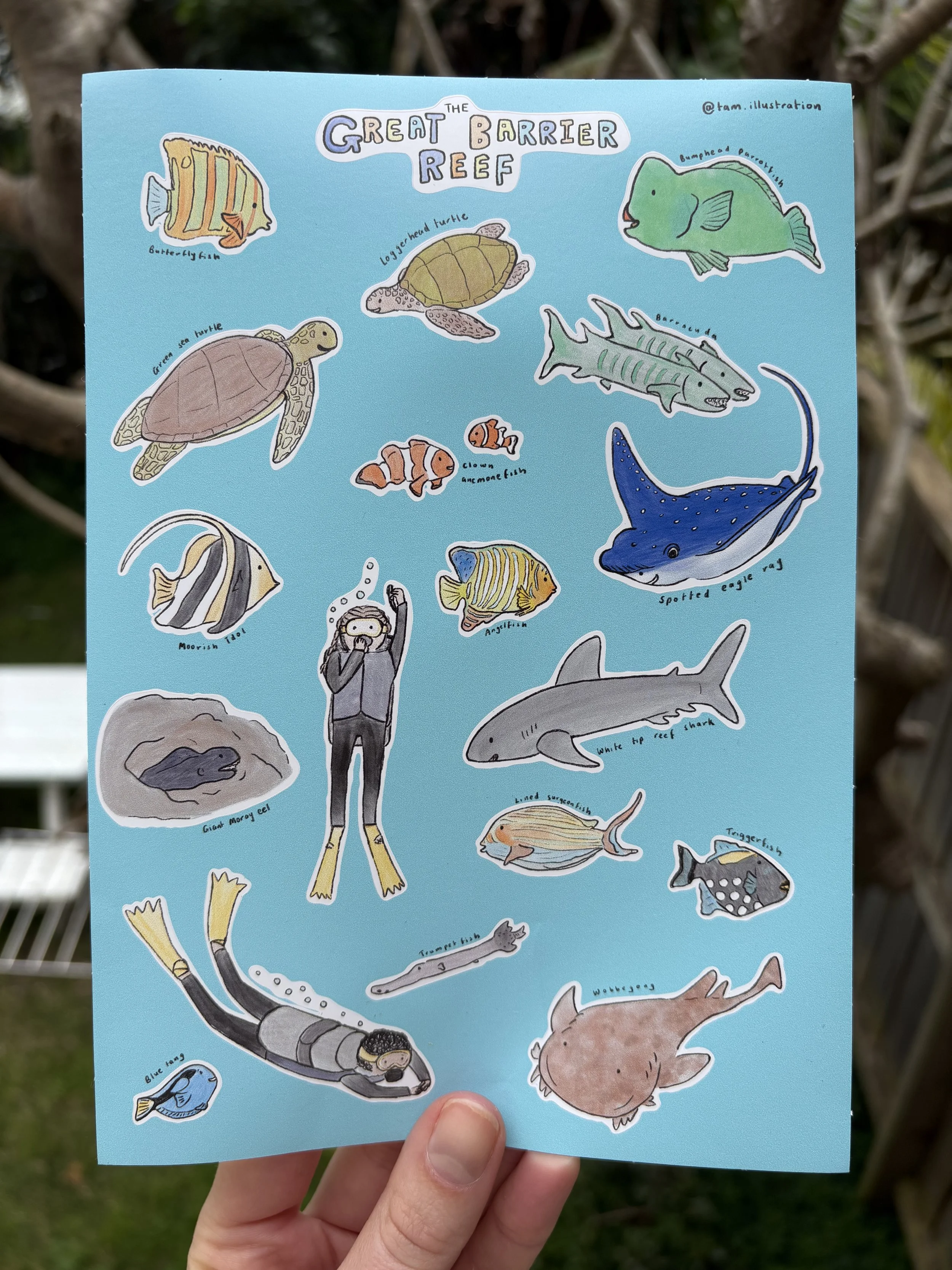 Shop Categories: All Greeting cards Prints Stickers All | Greeting cards | Prints | Stickers | Girl's wave print Great Barrier Reef stickers